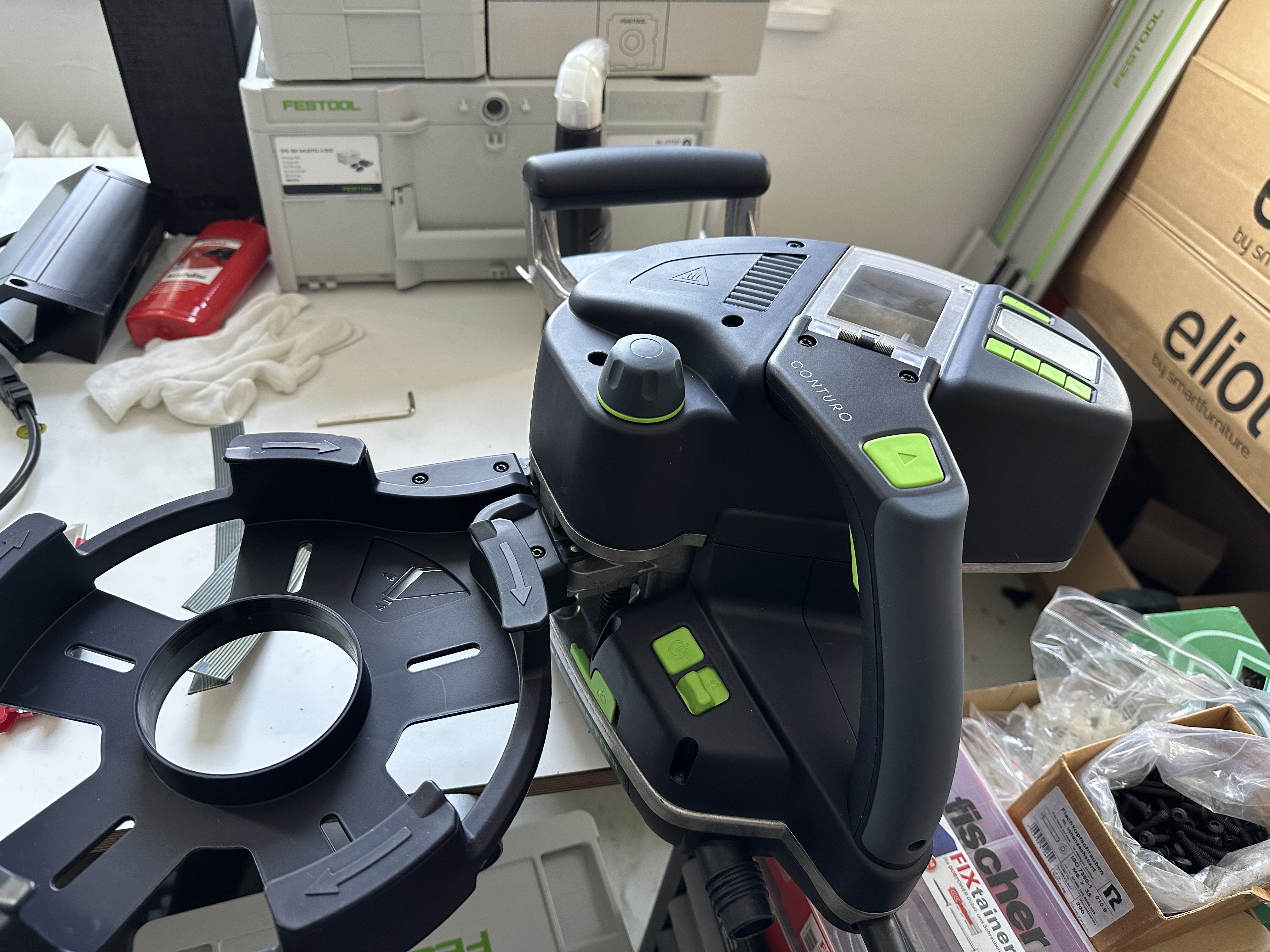 Spannender als sägen ist das Bekanten – mit dem Festool Conturo KA 65. Passende Kanten für die Platten haben wir bei unseren Lieferanten bestellt. Erstes Experiment Anfang Januar 2024 war noch verbesserungswürdig.