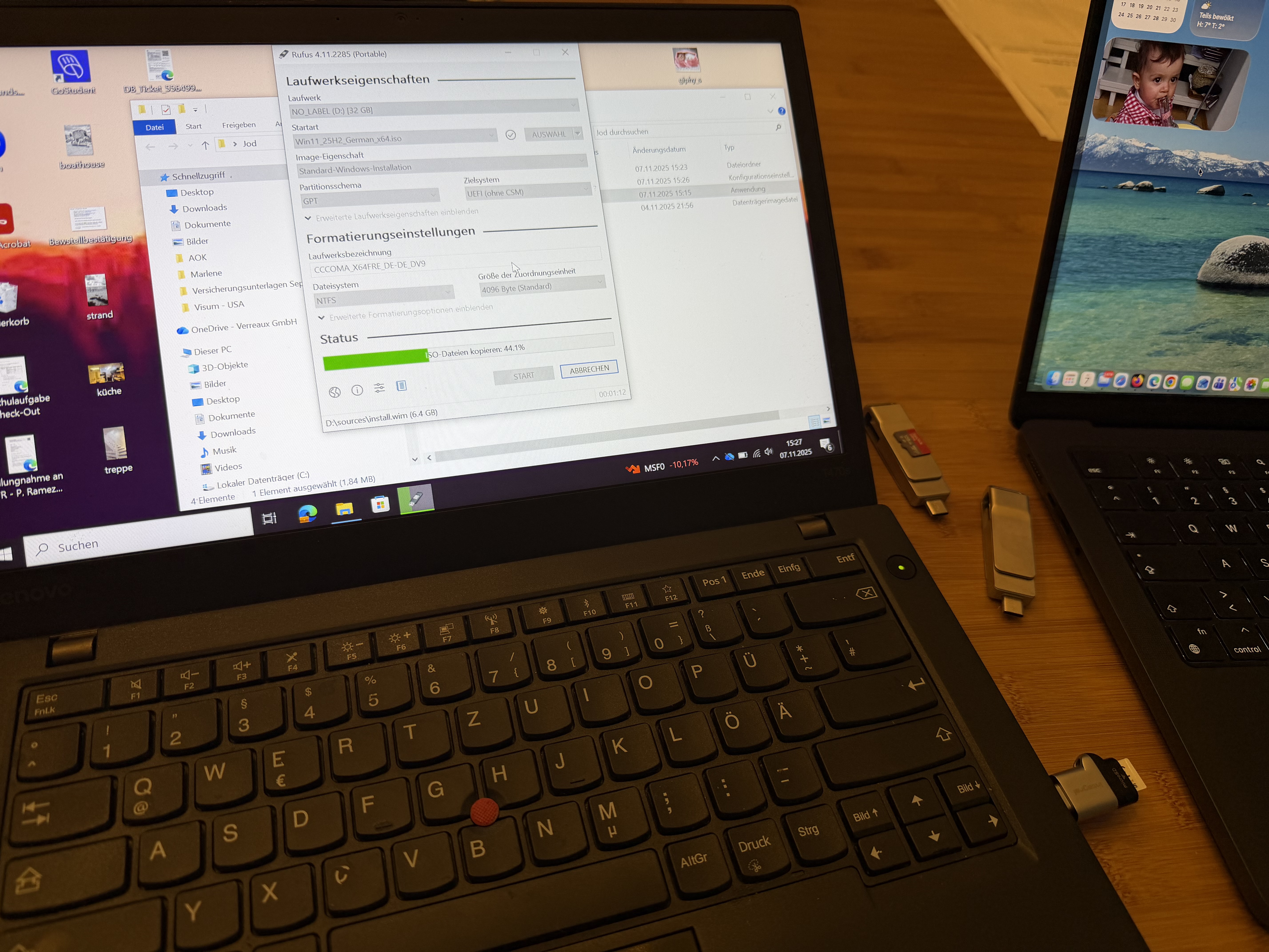 Das wird mit Bordmitteln leider nichts – der bewährte Balena Etcher verwandelt das bei Microsoft heruntergeladene ISO Image nicht zu einem bootfähigen Datenträger. Hilfe brachte Reddit und dann ein Windows Laptop mit Rufus.