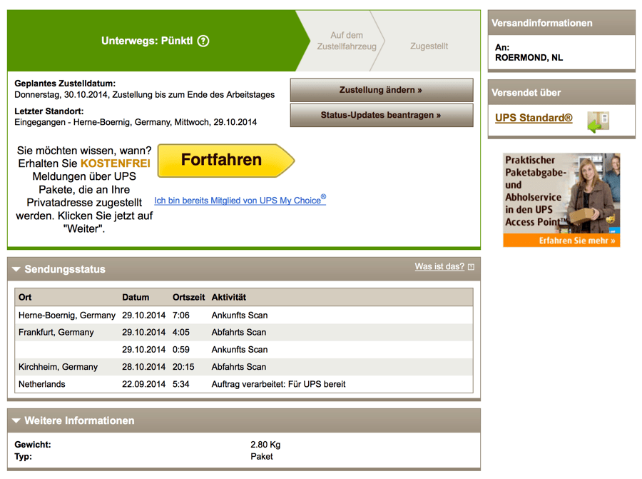 Schritt 7 – Tracking bei UPS – die Tage zwischen 22.9 und Ende Oktober habe ich selber vergeigt
