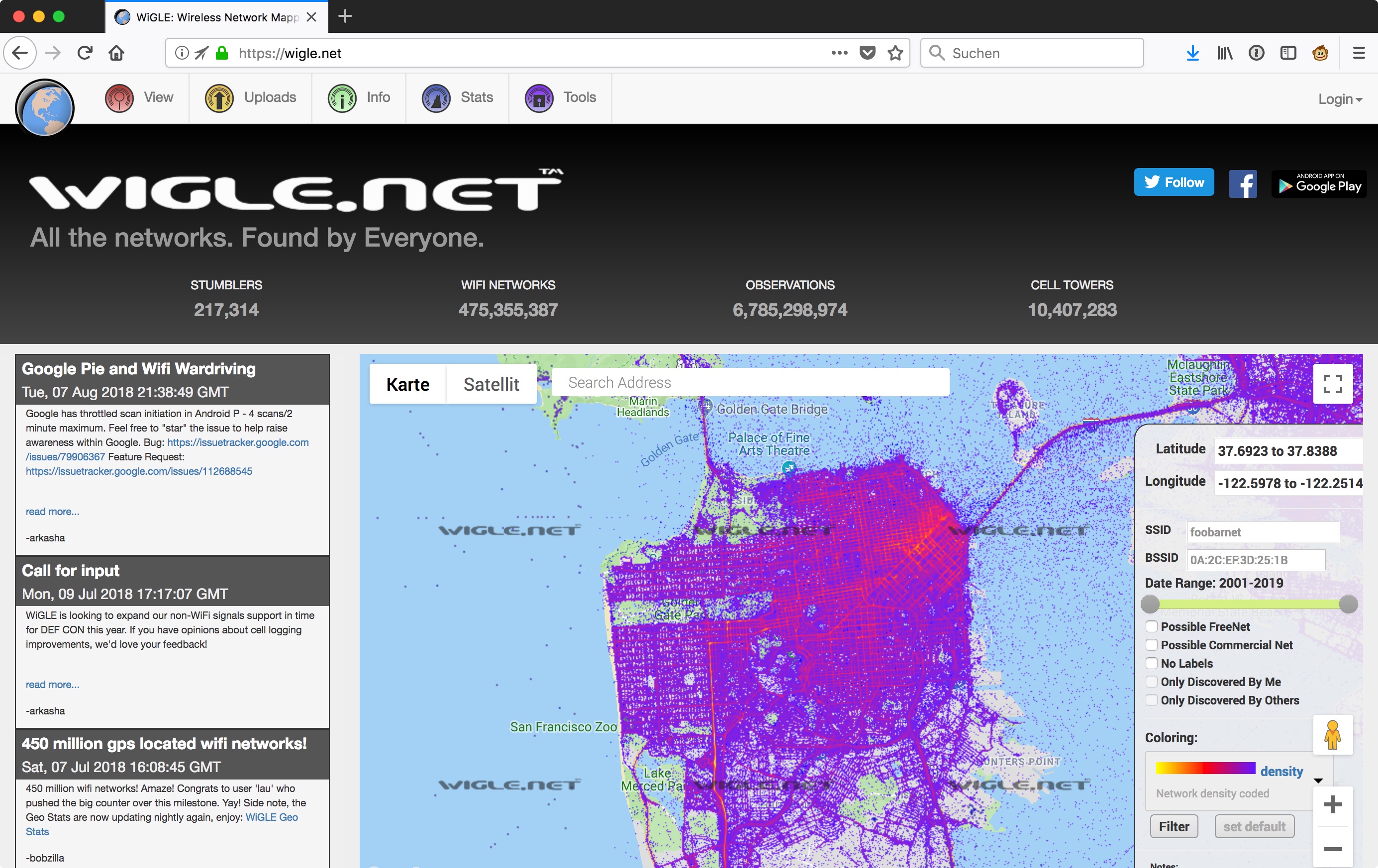 WiGLE gibt es seit September 2001. Im Juni kannte die Datenbank 349Mio WLAN Netzwerke. Aktuell sind es 482Millionen.