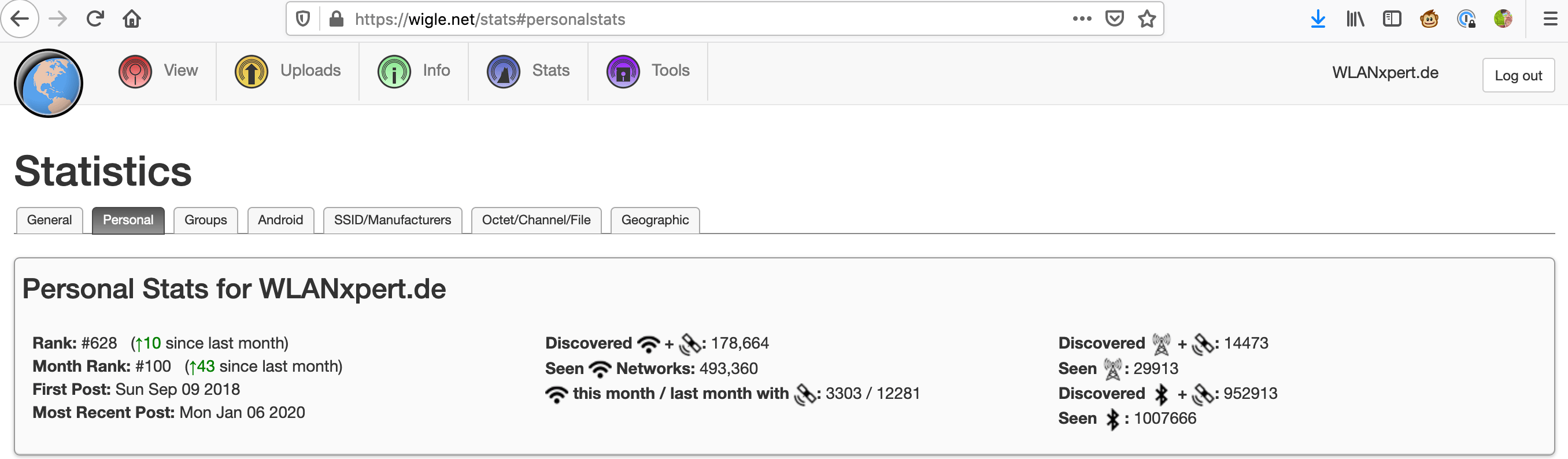 Von September 2018 und Platz 5.400 in der globalen Wardriver Liste bin ich jetzt auf Platz 628 angekommen.